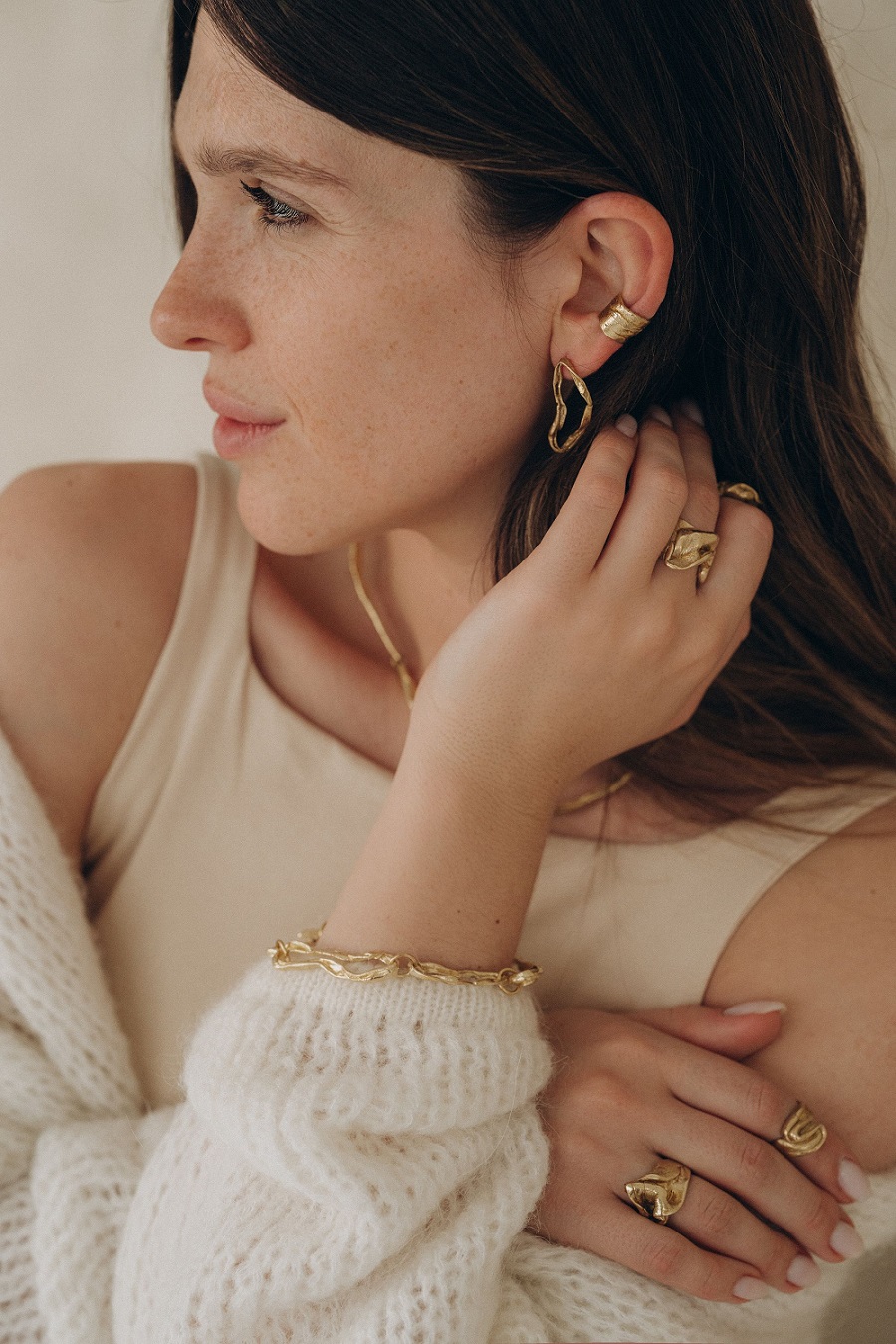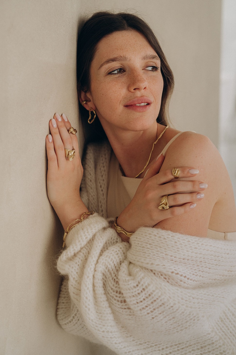Forma powstała dzięki wyrzeźbieniu w wosku. To właśnie temu procesowi zawdzięcza swój unikatowy charakter. Znajdziesz tutaj załamania i swoistą miękkość metalu. Delikatne pulsowanie krawędzi i nieregularność.